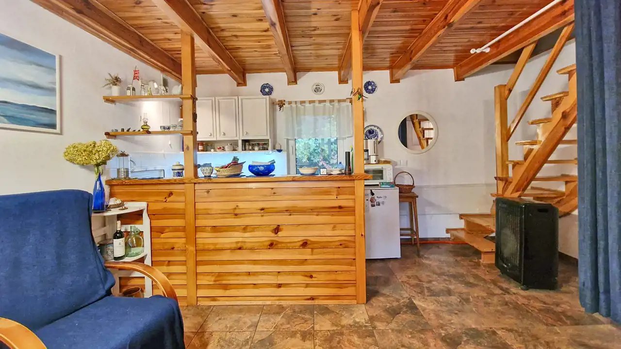 Parter: pokój dzienny z aneksem kuchennym 18,8 m2, łazienka /prysznic, wc, umywalka/ 2,45 m2. Zadaszony taras przed budynkiem: 5,2 m2, niezadaszona część tarasu to 11 m2.