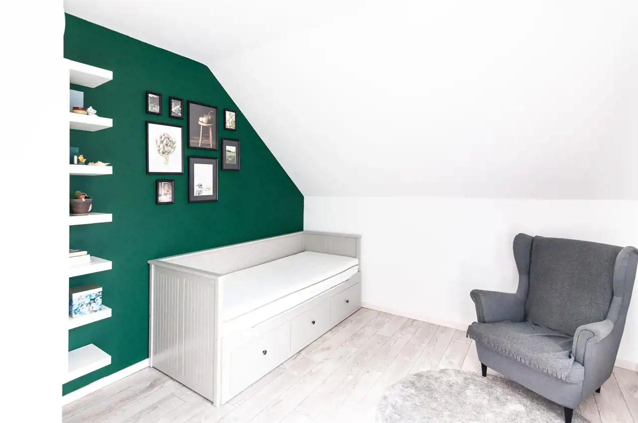 Poddasze użytkowe to trzy komfortowe sypialnie, każda o powierzchni około 12 m2, idealne na miejsca wypoczynku. Do dyspozycji mieszkańców jest również przestronna łazienka z wanną (około 8 m2) oraz holl o powierzchni 10 m2, zapewniający wygodne poruszanie się po całym domu.