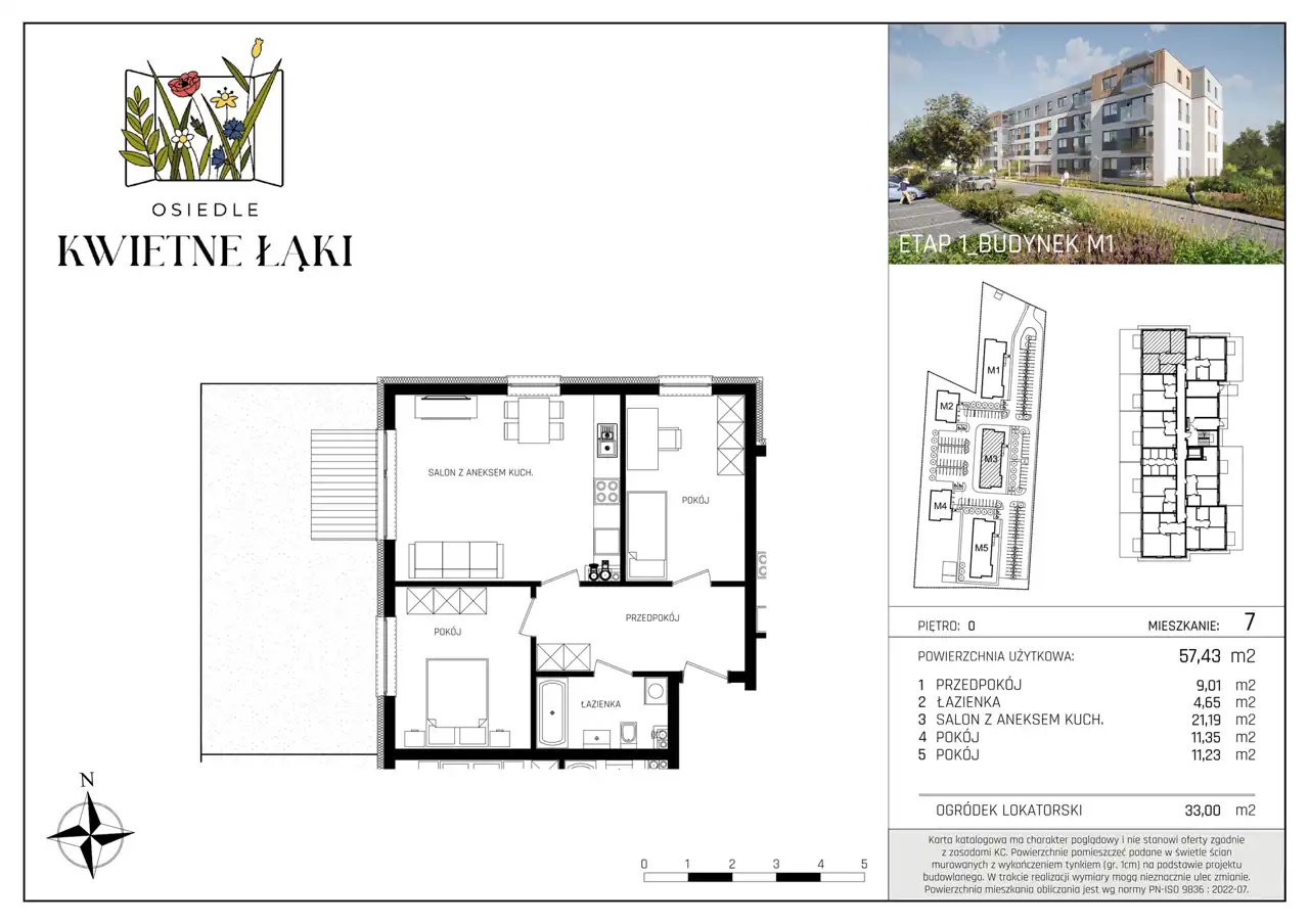 Mieszkanie 57,43 m kw. z oknami od strony północno zachodniej. Salon z aneksem kuchennym. Dwie sypialnia i łazienka z WC w wygodnym ustawieniu. Przestronny, ustawny przedpokój oraz ogródek o powierzchni aż 33 m2.