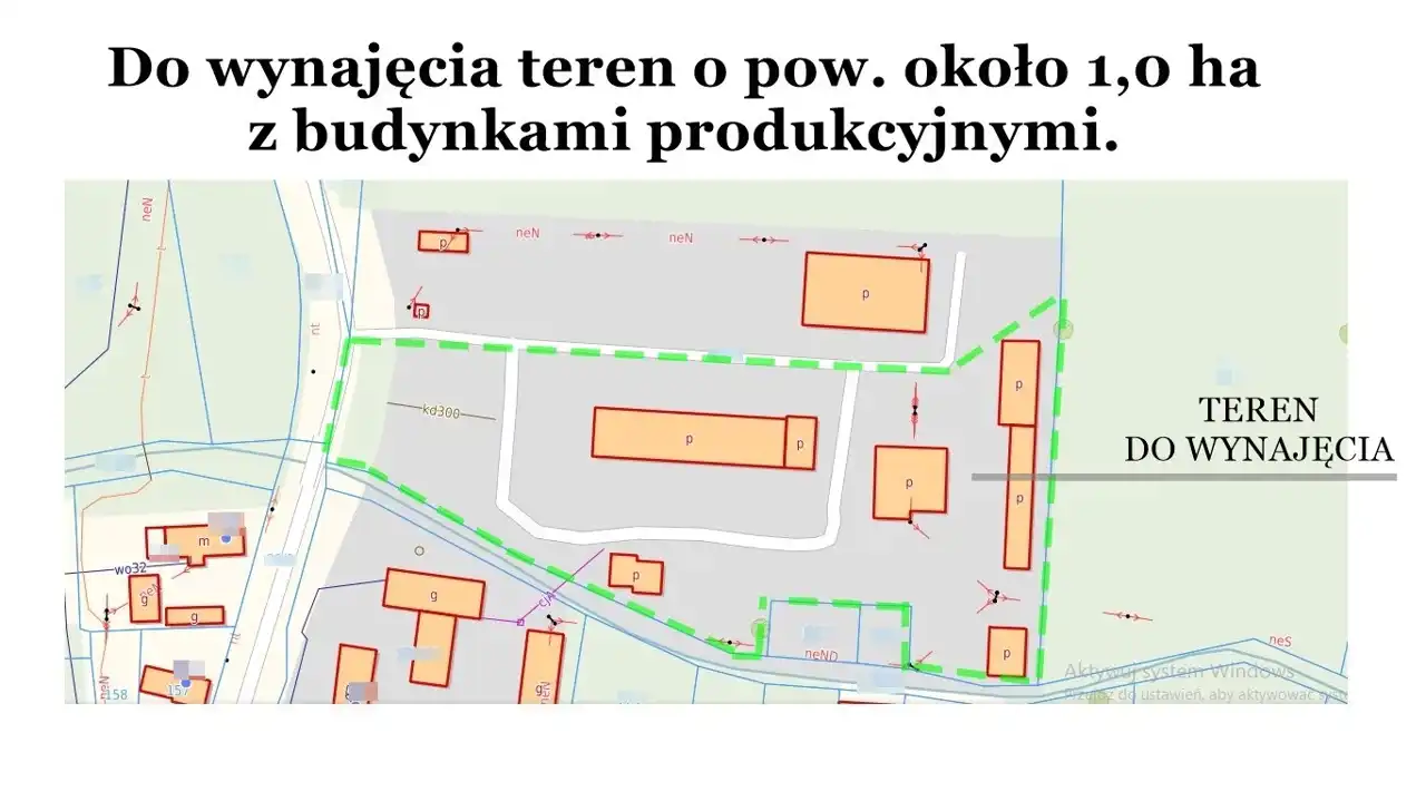 Kształt działki został przedstawiony na mapce, dodatkowym udogodnieniem jest jej płaskie ukształtowanie. Dojazd do nieruchomości dogodny – drogą asfaltową. Na działce znajdują się budynki o następujących powierzchniach zabudowy: zadaszona hala o pow. ok. 600m2, budynek połączony z haląo pow. ok. 100m2, zespół dwóch budynków o pow. ok. 199m2 i 226 m2, budynek o pow. ok. 114m2, budynek o pow. ok. 311m2, budynek o pow. 106m2.