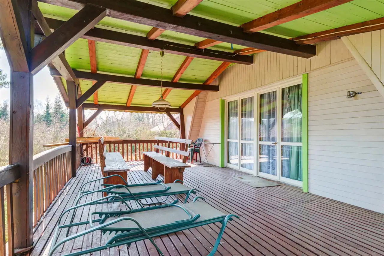 Dom jest 3 - kondygnacyjny, z czego przyziemna kondygnacja jest murowana. Dom ma powierzchnię zabudowy około 100 mkw, a jego powierzchnia całkowita wynosi około 200 mkw. Dom posiada grzejniki elektryczne i duży kominek. Dom został dodatkowo docieplony w momencie wymiany dachu (więźba dachowa jest stalowa). Do remontu: łazienka, ewent wymiana okien, malowanie elewacji. Na działce dodatkowo nowa wiata z przeznaczeniem na auto lub łódź.