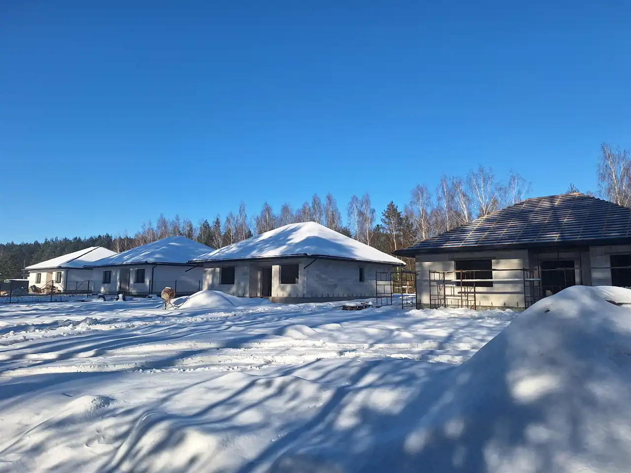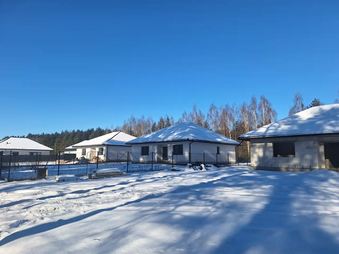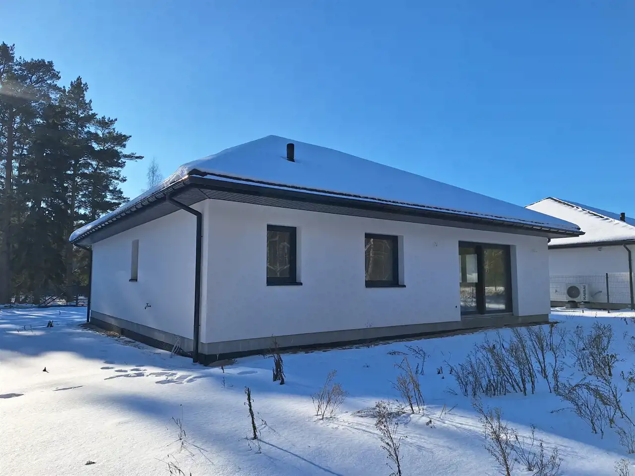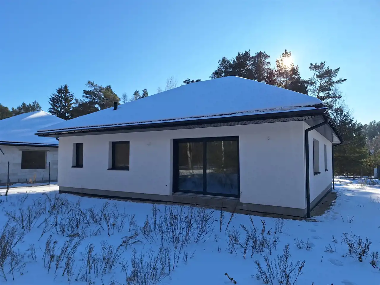 Dom jednorodzinny parterowy o pow. użytkowej 117,46 mkw (125,38 mkw całkowitej) w stanie do wykończenia - deweloperskim, posadowiony na działce o powierzchni 1000 mkw, w spokojnej i zielonej miejscowości Kępiaste gm. Pokrzywnica niedaleko miasta Serock. Zbudowany z solidnych materiałów tj. tynk twardy wew. i na zew., pustak suporex. Dach pokryty blachodachówką w kolorze grafit. Okna trzyszybowe. Rozprowadzona instalacja wodna, elektryczna i grzewcza (ogrzewanie podłogowe), system rekuperacji. Działka ogrodzona systemem panelowym z bramą i furtką. Do wykonania przez przyszłego Inwestora: opaska z kostki wokół domu, podjazd, taras.