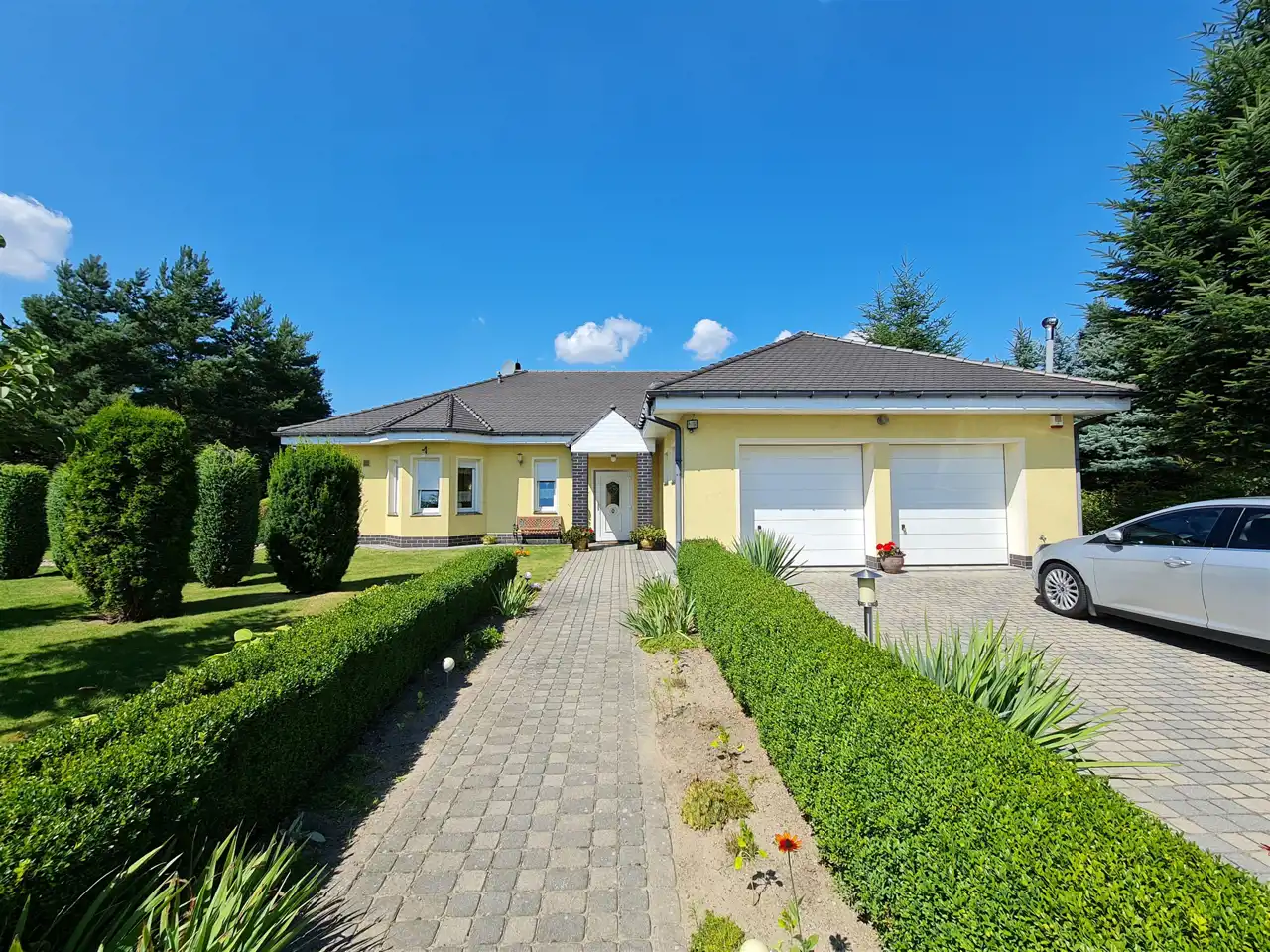 Na powierzchni 198 m2 znajduje się salon z kominkiem i z wyjściem na taras, 3 sypialnie, garderoba, 2 łazienki, kuchnia ze spiżarnią i tarasem, 2-stanowiskowy garaż i dwie bramy automatyczne.