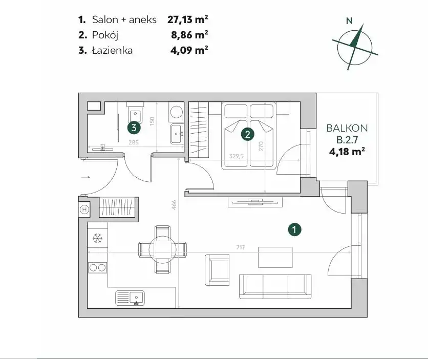 - salonu z aneksem kuchennym z bezpośrednim wyjściem na balkon