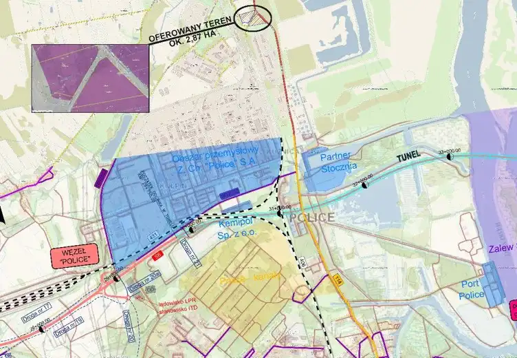 Mamy przyjemność zaprezentować Państwu atrakcyjny teren inwestycyjny o pow. ok. 2,86 ha, składający się z kilu działek w użytkowaniu wieczystym, położony w pobliżu Zakładów Chemicznych Police i Portu Police, w odległości ok. 2 km od planowanego tunelu Police-Święta, będącego częścią Zachodniego Obejścia Szczecina.