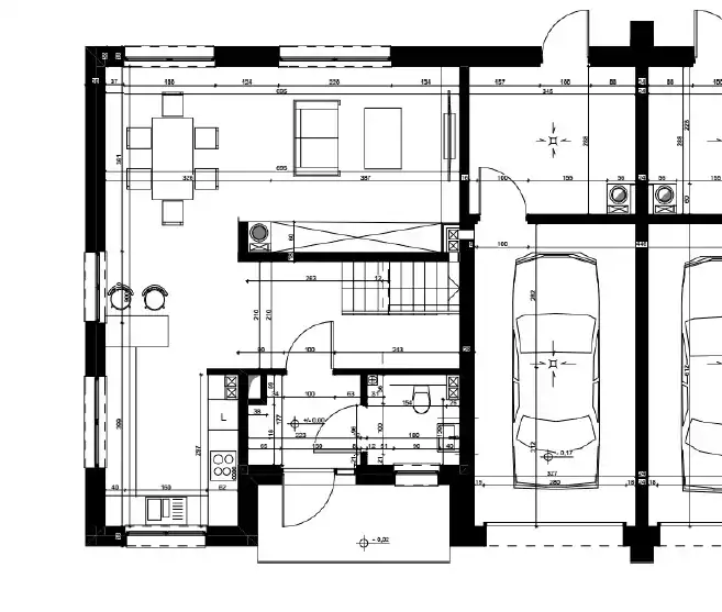 Parter: salon z aneksem kuchennym i jadalnią o łącznej powierzchni 40m2, WC 3m2, komunikacja 13m2 z wiatrołapem, garaż jednostanowiskowy i pomieszczenie gospodarcze,