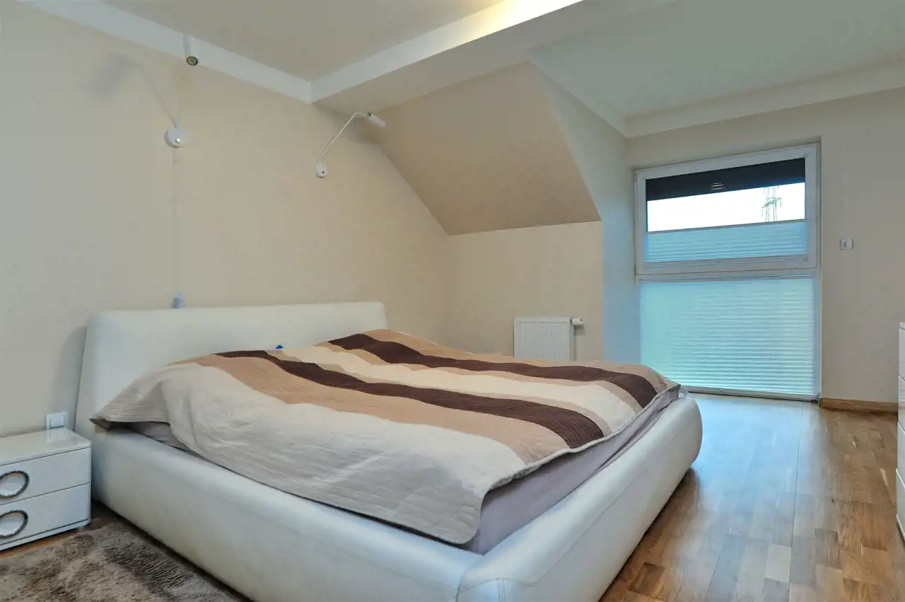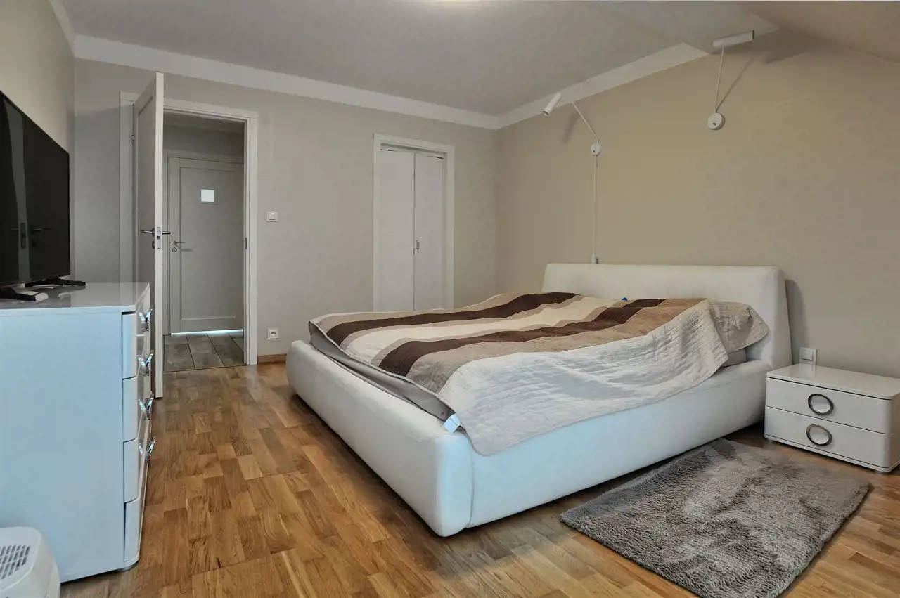 Piętro: trzy komfortowe sypialnie (jedna z garderobą), elegancka łazienka z wanną, prysznicem, bidetem i podwójną umywalką, wyjście na balkon z łazienki i sypialni.
