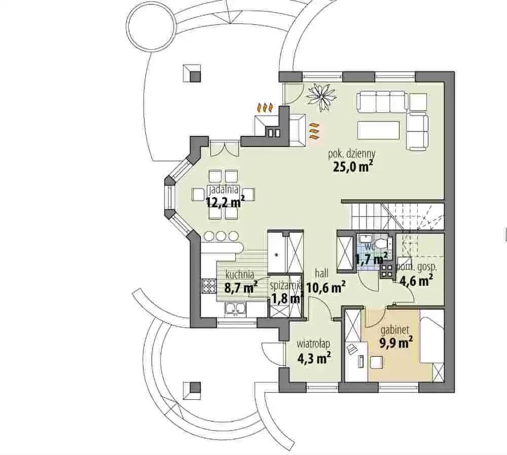 Na parterze znajduje się część dzienna z obszernym salonem połączonym z jadalnią i kuchnią, gabinet, łazienka oraz część gospodarcza.