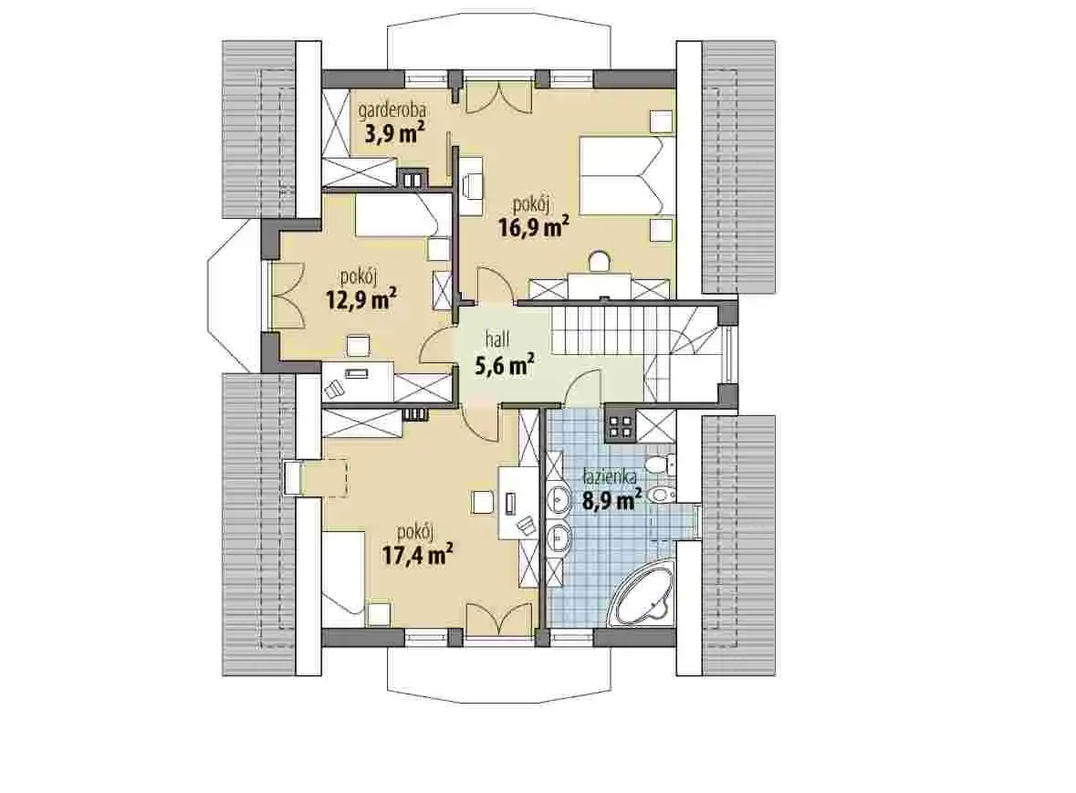 Na poddaszu zlokalizowano część nocną z trzema sypialniami(w tym jedna z własną garderobą) oraz ogólnodostępną łazienką.
