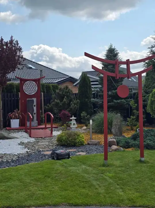 Ogród w stylu Japońskim, z podlewaniem automatycznym, zadaszony i przeszklony taras.