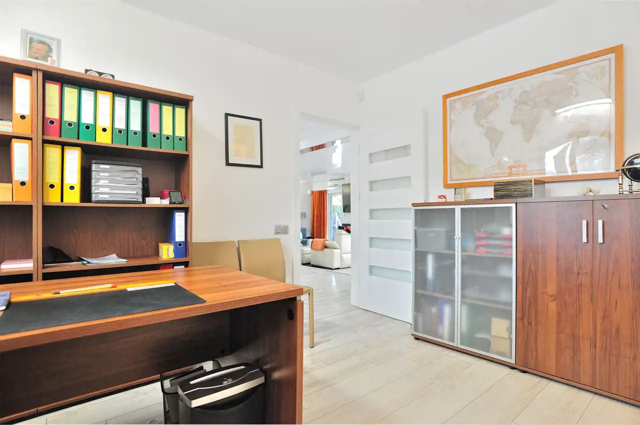 Pietro: sypialnia z oknem na ogród i garderobą, pokoj, zagospodarowany hol w z biblioteką i drugim biurem, oraz pokój kąpielowy.