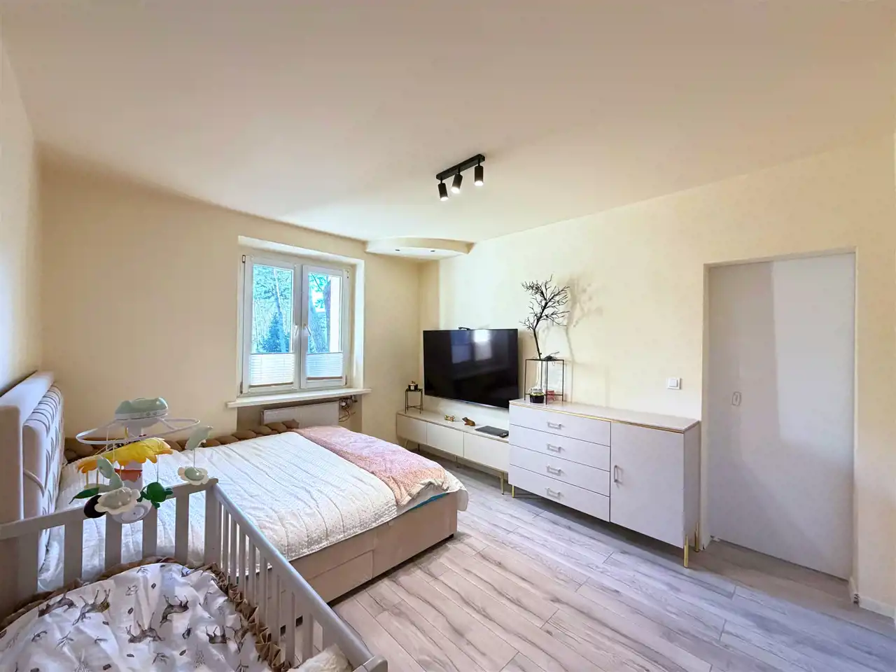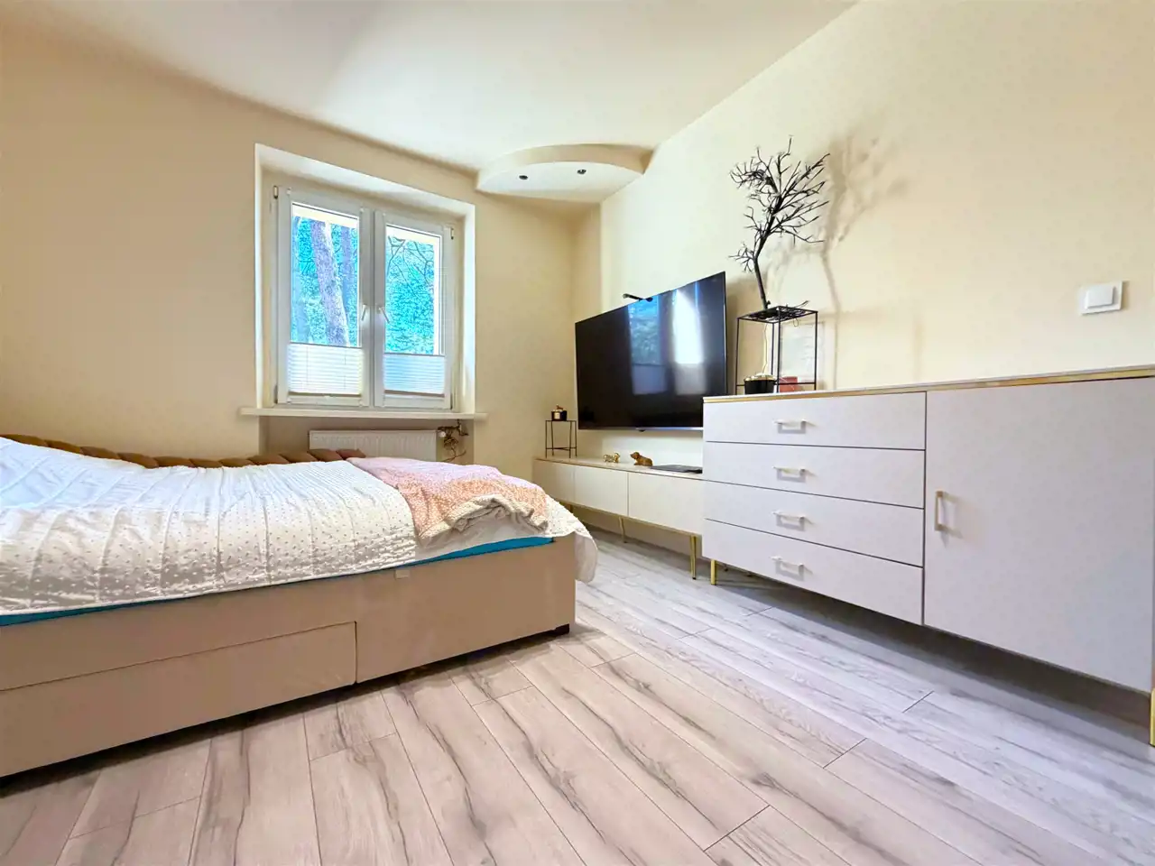 Mieszkanie składa się z 2 odrębnych pokoi, przedpokoju, kuchni, łazienki z kabiną prysznicową oraz osobnego WC. Do lokalu przynależy piwnica o powierzchni 6m2 . Do nieruchomości także przynależy umowny zagospodarowany w huśtawkę, altankę, palenisko ogródek o powierzchni 120m2 oraz dwa miejsca postojowe na terenie nieruchomości.