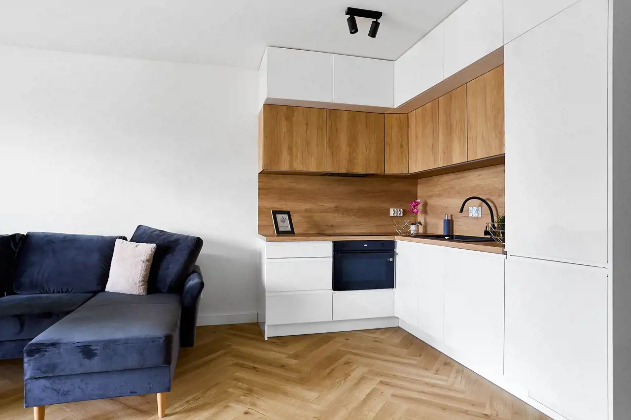 Wnętrze zostało urządzone z dużą starannością, przy użyciu materiałów wysokiej jakości. Styl minimalistyczny, naturalna kolorystyka i funkcjonalne rozwiązania tworzą harmonijną, przyjazną przestrzeń.