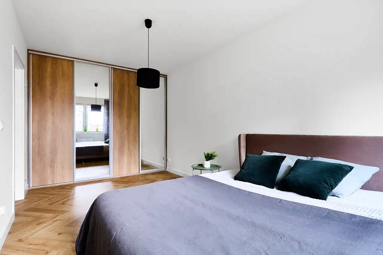 - Sypialnię (17 m²) z pojemną szafą w zabudowie