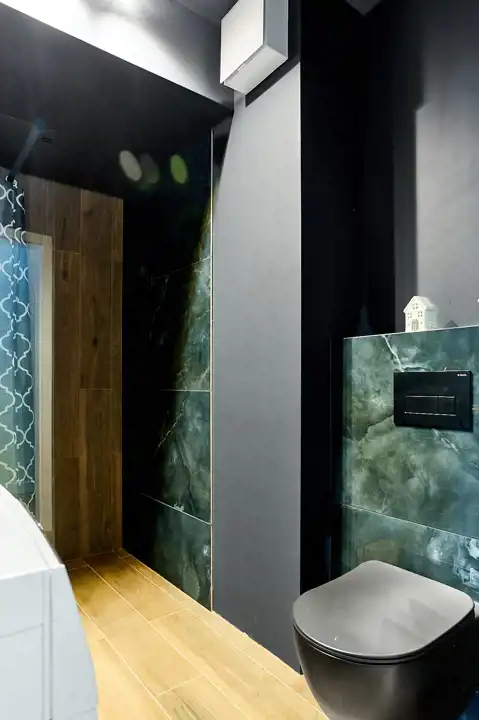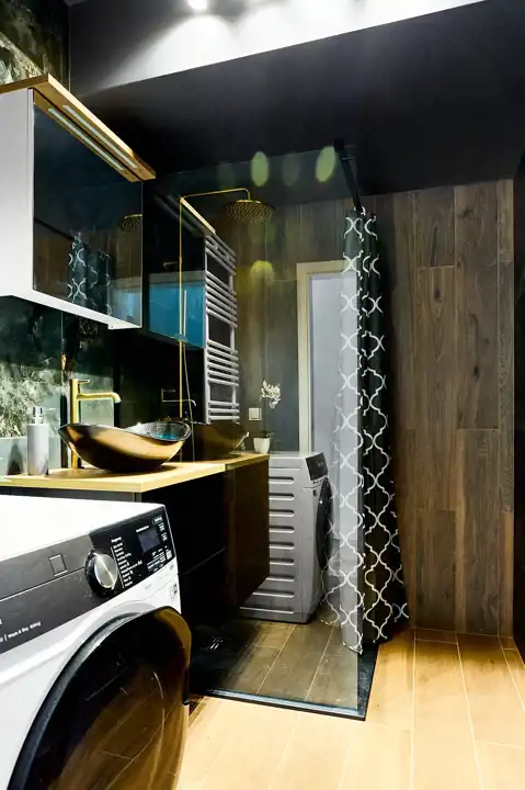 - Stylową łazienkę z przeszkloną kabiną prysznicową