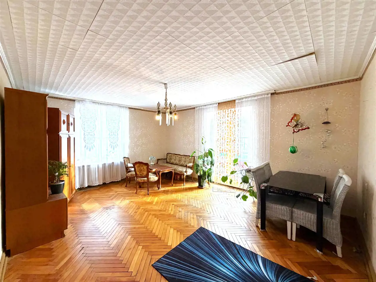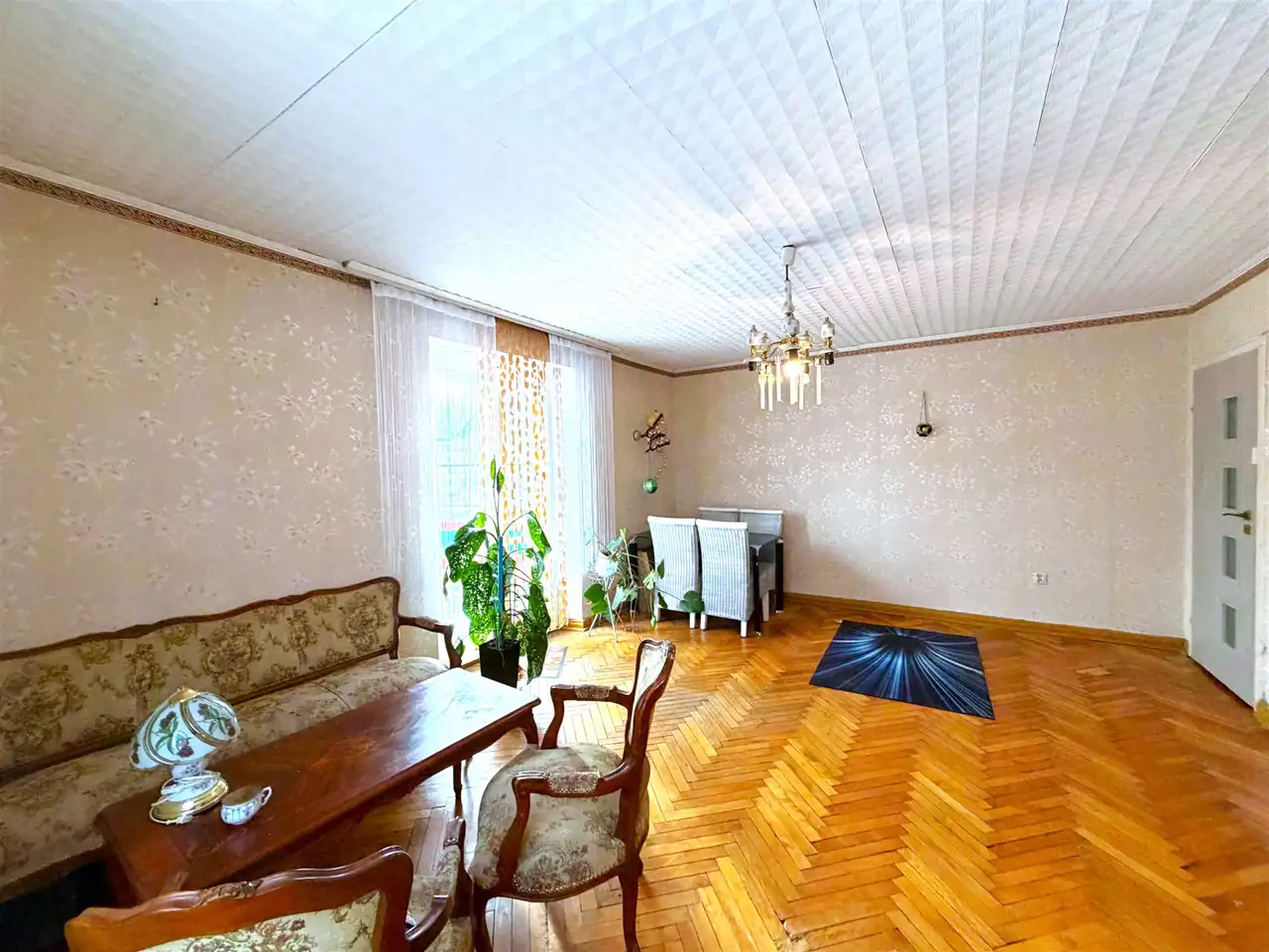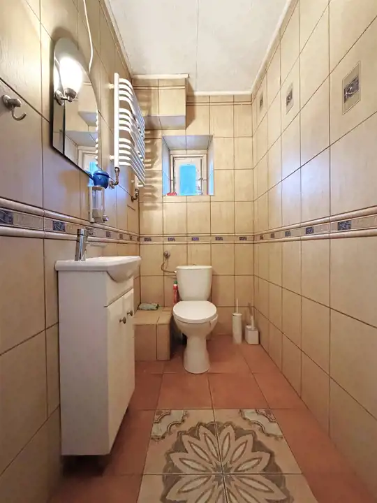 Mieszkanie składa się z 4 odrębnych pokoi, balkonu, przedpokoju, kuchni, łazienki z kabiną prysznicową oraz osobnego WC. Do lokalu przynależy pomieszczenie gospodarcze, oraz piwnica o łącznej powierzchni 39,8m2 . Przy domu znajduje się ogródek do wspólnego użytkowania, ale istnieje możliwość cesji dzierżawy ogródka znajdującego się nieopodal nieruchomości o powierzchni około 100m2 bezpośrednio użytkowanego tylko przez obecnych właścicieli.