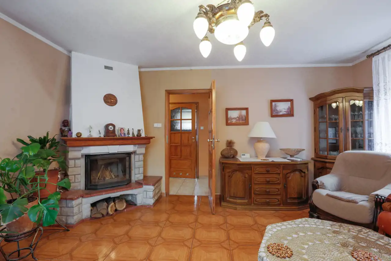 Na parterze znajduje się salon z balkonem, pokój wypoczynkowy z kominkiem i balkonem, kuchnia z jadalnią oraz łazienka i oddzielna toaleta.