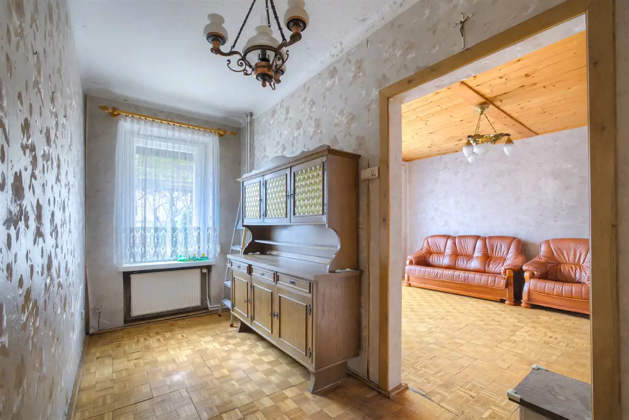 Budynek wymaga odświeżenia lub remontu, co daje możliwość dostosowania go do własnych potrzeb.