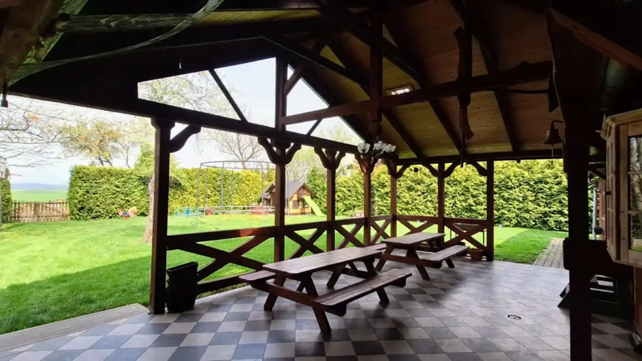 Z tyłu zadaszona wiata, ogród, pomieszczenia gospodarcze, piec na olej opałowy.