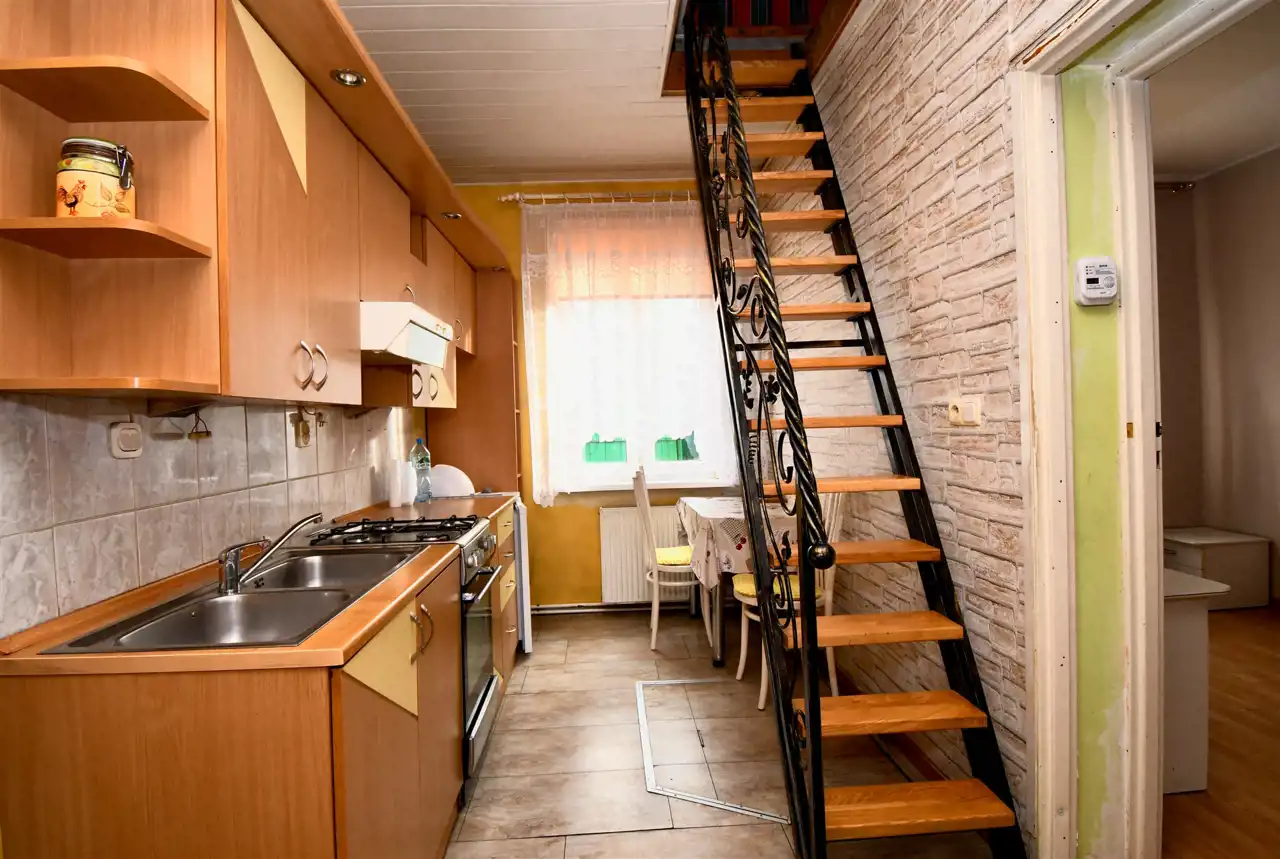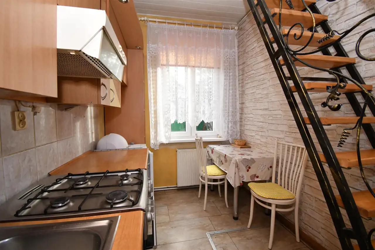 - Ogrzewanie: piec na paliwo stałe (drewno, węgiel), ciepła woda - bojler, kuchenka gazowa zasilana butlą gazową.