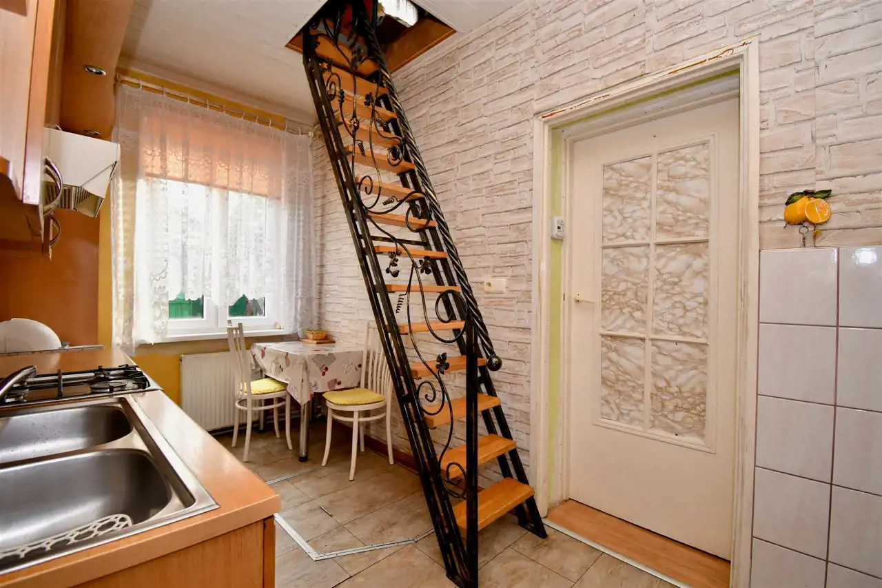 - Poddasze: pokój oraz strych do adaptacji, który można zaaranżować na dodatkowy pokój. Dostęp zapewniają estetyczne metalowe schody z drewnianymi stopniami.