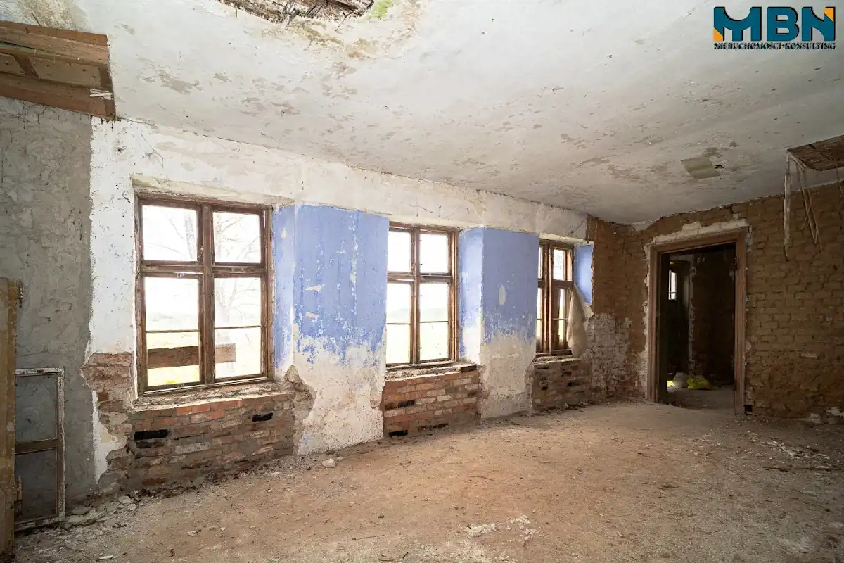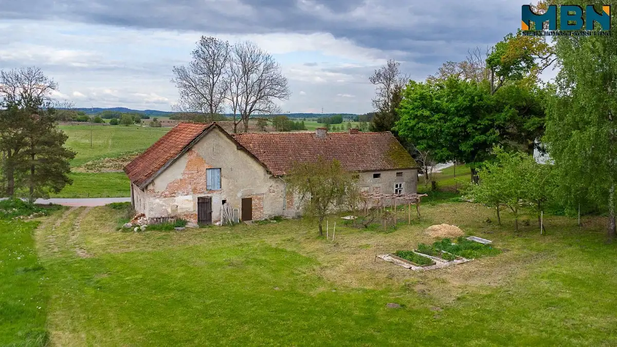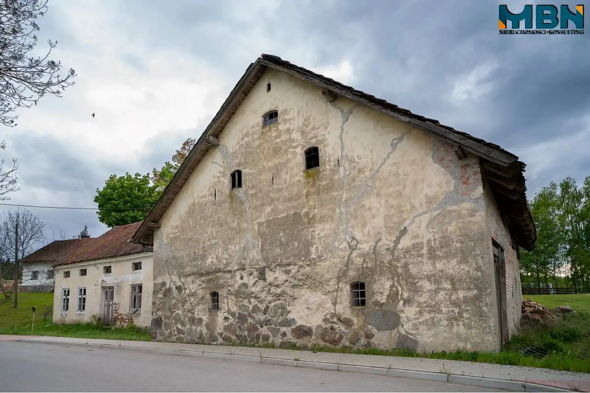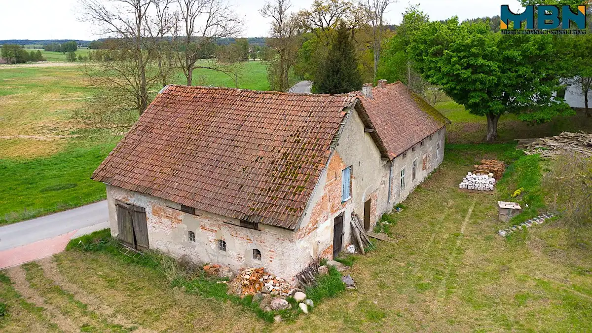 - Na działce o nr geod. 44 o pow. 1756m2 znajduje się stary pruski dom z 1900r o powierzchni zabudowy 160m2 z dobudowaną częścią gospodarczą o pow. zabudowy 150m2, objęty gminną ewidencją zabytków, uzbrojony w wodociąg, kanalizację, prąd. Dodatkowo na działce znajduje się głęboka studnia kopana;