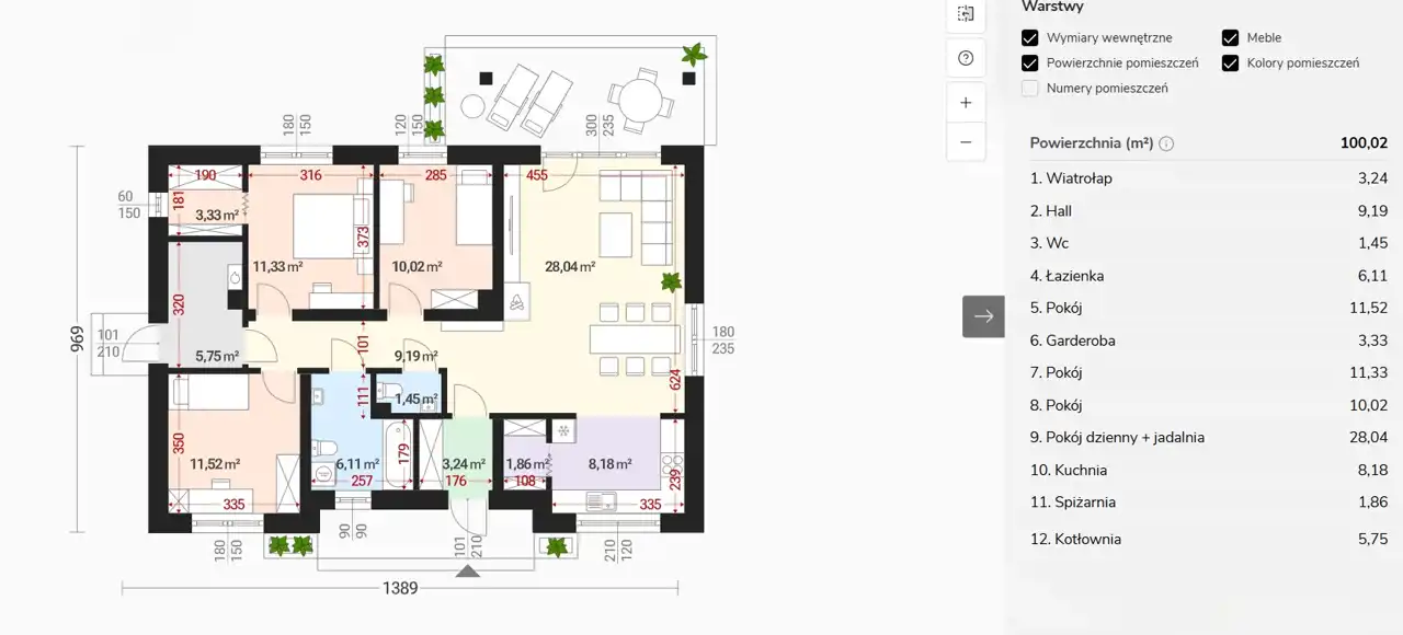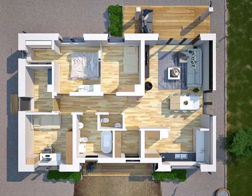Dom parterowy, zaprojektowany z myślą o 3-4 osobowej rodzinie. Układ funkcjonalny domu został podzielony na dwie strefy: dzienną i nocną. W strefie dziennej zaprojektowano przestronny salon z jadalnią oraz otwartą kuchnię ze spiżarnią. W części nocnej zaprojektowano trzy sypialnie. Jedna z nich to sypialnia główna, która ma prywatną garderobę. Dwie pozostałe sypialnie są przeznaczone dla dzieci lub gości. W części wspólnej znajduje się łazienka oraz kotłownia. Zaletą jest prosta bryła z dwuspadowym dachem z nowoczesnym wykończeniem elewacji.