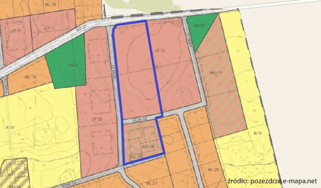 Działka objęta jest miejscowym planem zagospodarowania przestrzennego i oznaczona symbolami: UT 13 – Teren zabudowy usług turystycznych, MU 18 – Teren zabudowy mieszkaniowo-usługowej.