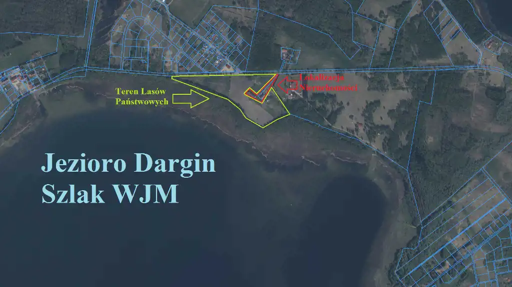 Teren z linią brzegową jeziora, wokół okalający działkę (blisko 6ha) należy do skarbu Państwa – Lasy Państwowe (obecnie dzierżawiony)