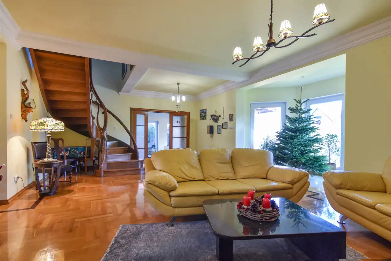 Obecnie na parterze domu znajduje się przestronny jasny salon z dużą jadalnią oraz pięknym zimowym ogrodem. To spore otwarte przestrzenie ale w razie zmiany koncepcji istnieje możliwość swobodnego wyodrębnienia na dole dodatkowego osobnego pokoju. Poza tym mamy tam jeszcze kuchnię, łazienkę i pomieszczenie gospodarcze.