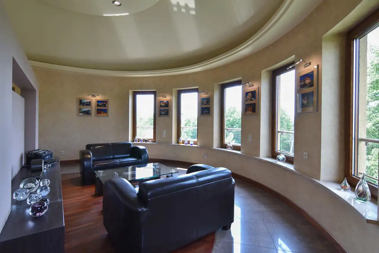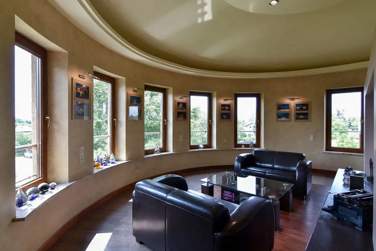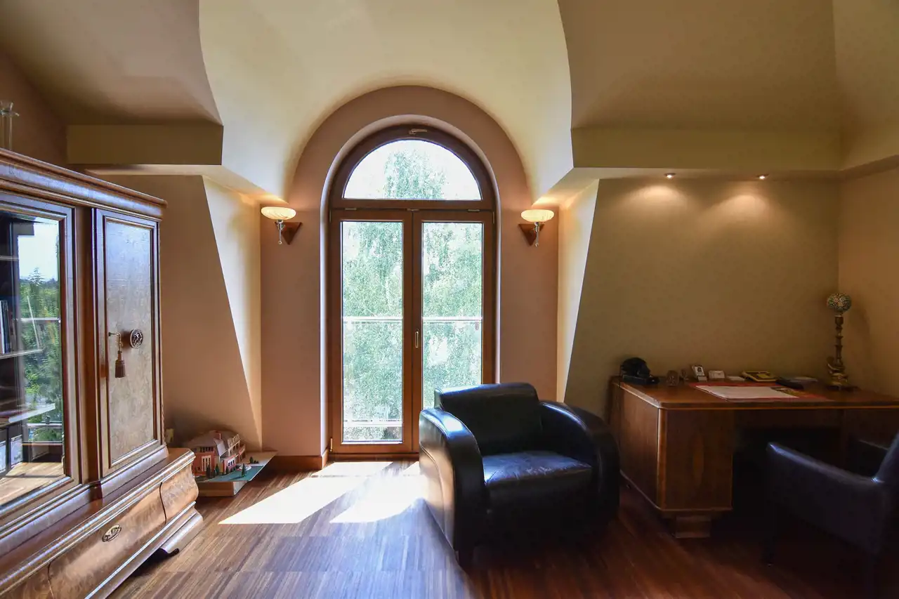 przestronny, jasny pokój z wydzieloną częścią biurową i dużymi oknami,