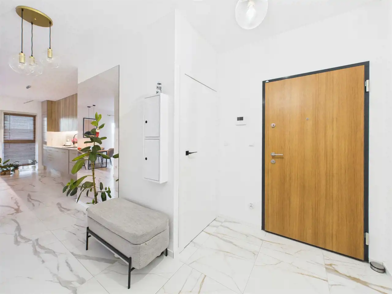 Wnętrze jest jasne, ciepłe i doskonale wyciszone. Zimą mieszkanie świetnie trzyma temperaturę, a latem zapewnia komfort dzięki przemyślanemu układowi i nasłonecznieniu.