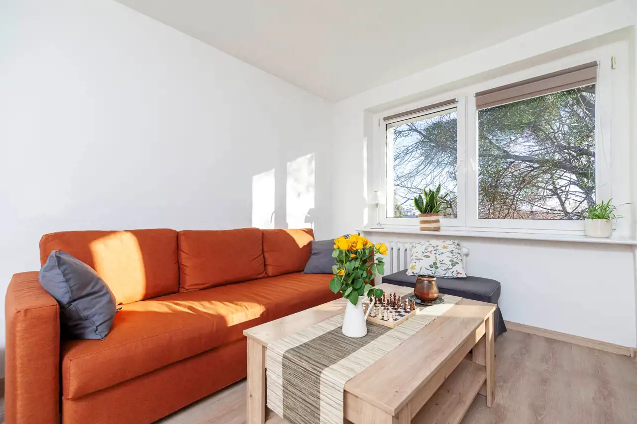 Cena mieszkania nie obejmuje wyposażenia pokoju widocznego na zdjęciach, lodówki oraz pralki.