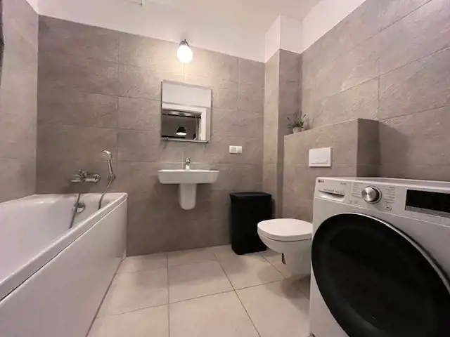 - łazienka w płytkach, z wanną