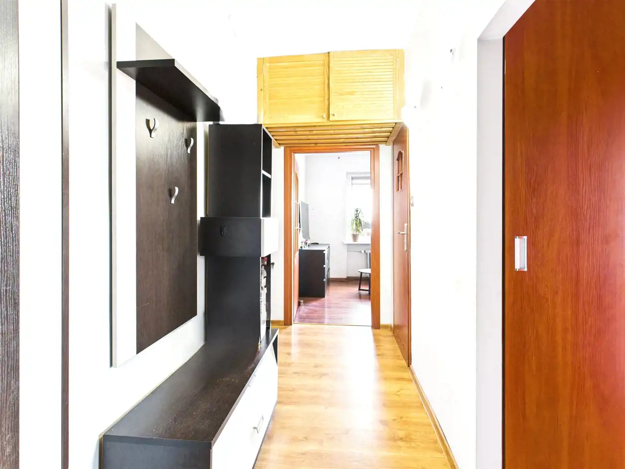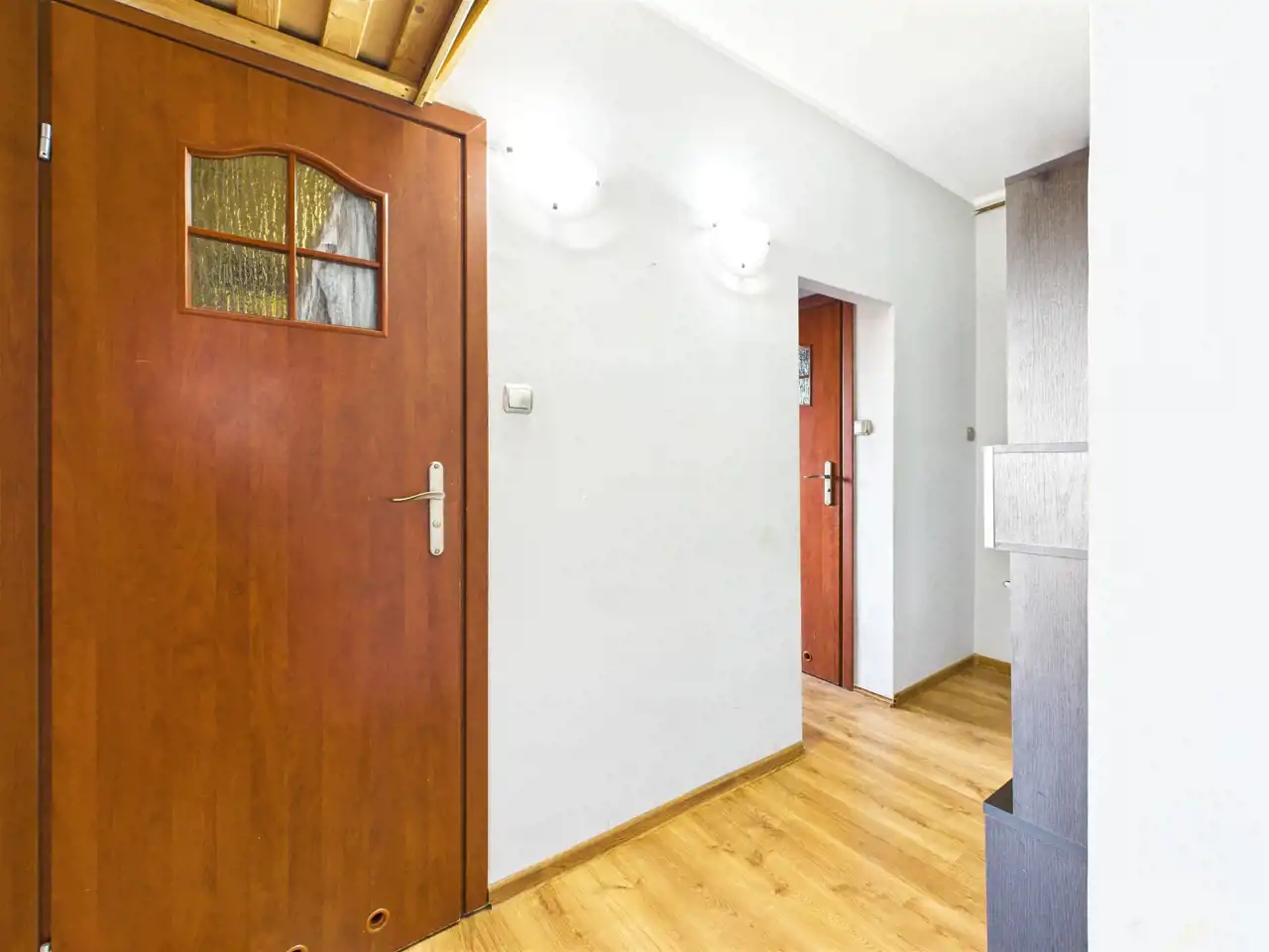 W przedpokoju znajduje się szafa w zabudowie oraz pawlacz, zapewniające wygodną przestrzeń do przechowywania.