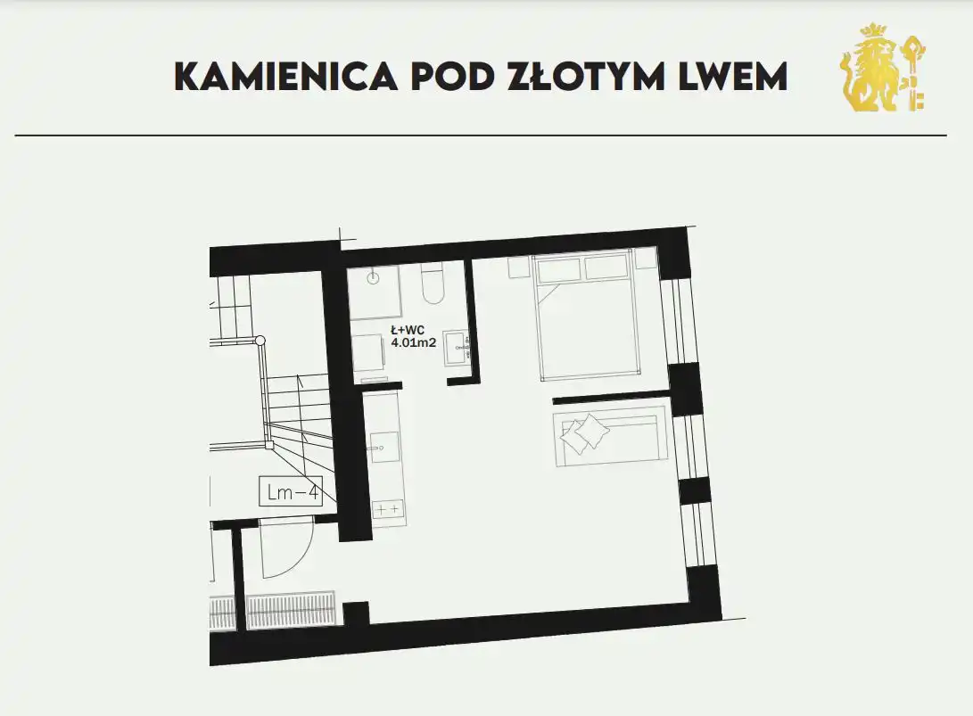 Lokal składa się z: salonu z aneksem kuchennym, sypialni wydzielonej ścianami działowymi, łazienki.