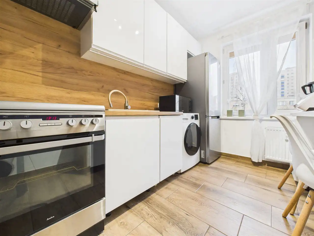 kuchnia: kuchenka z piekarnikiem, lodówka, pralka