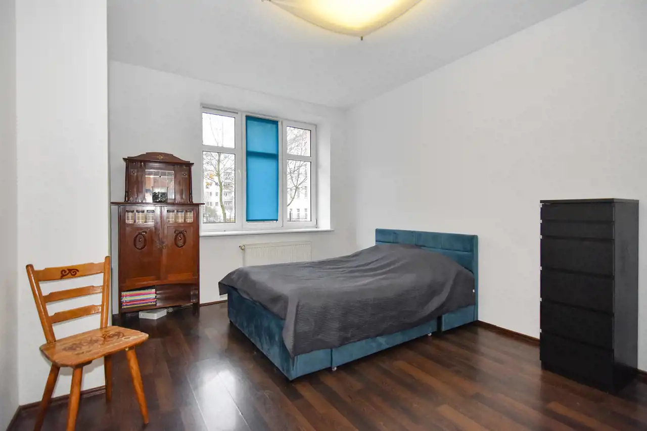 Rozkład mieszkania jest dwustronny z wysokimi oknami co daje dużo światła i przestrzeni.