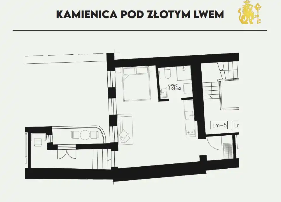 Lokal składa się z: salonu z aneksem kuchennym (z miejscem na podwójne łóżko), pomieszczenia z możliwością zaaranżowania na gabinet/biblioteczkę z wyjściem na balkon (widok na dziedziniec), łazienki.
