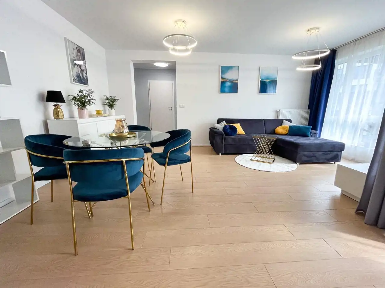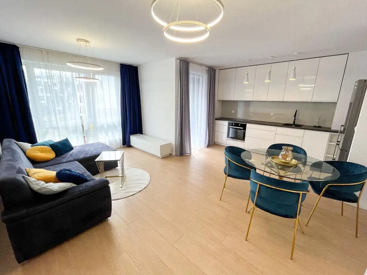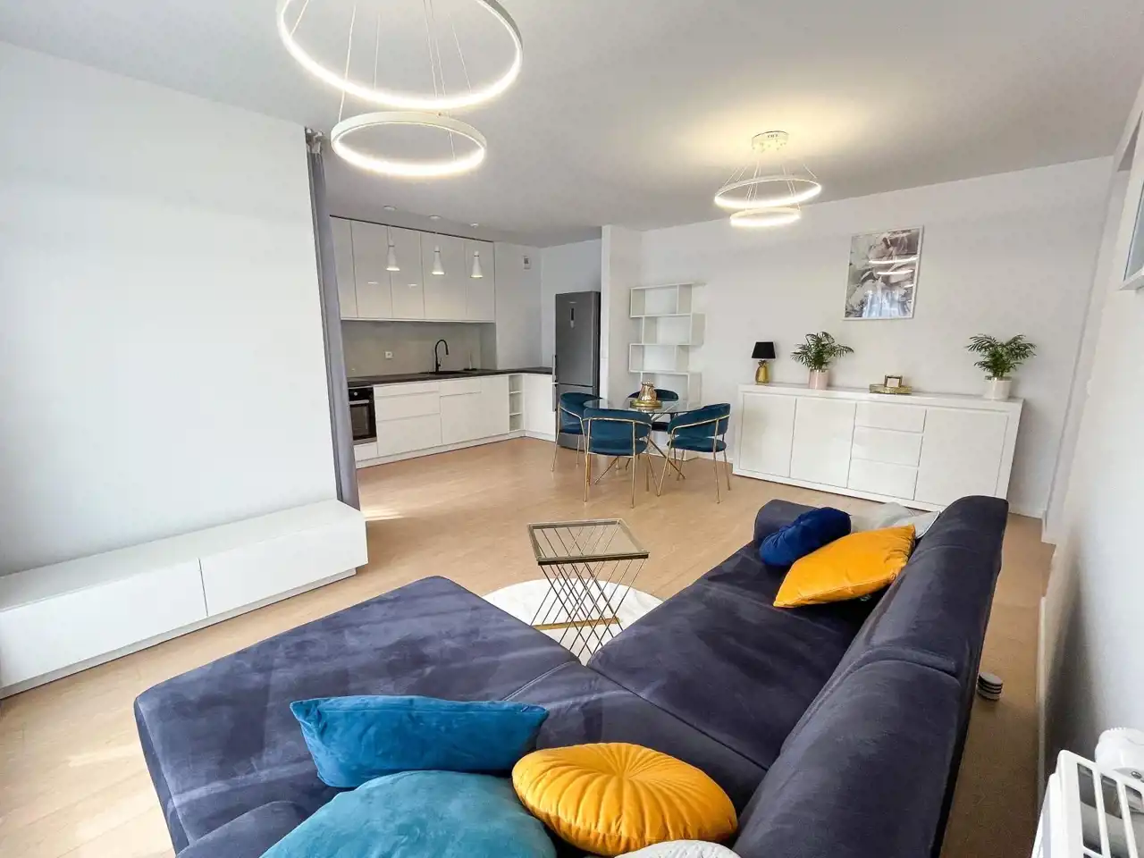 - kuchnia w nowoczesnej zabudowie wraz ze sprzętem AGD (zmywarka, płyta indukcyjna, piekarnik, lodówka, pochłaniacz),