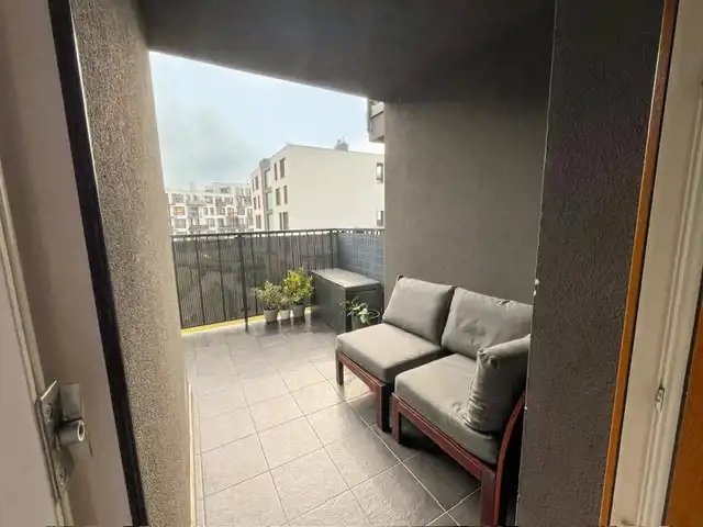 Duży balkon, na którym możesz wypić poranną kawę, poczytać książkę lub po prostu odpocząć na świeżym powietrzu.