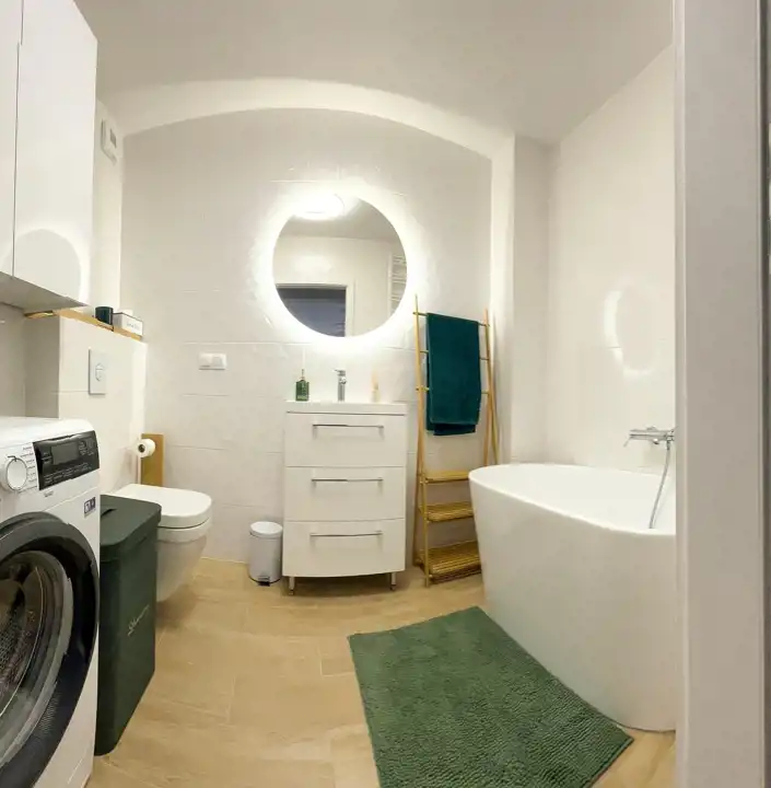 - łazienka wykończona w płytkach, z wanną, pralka.