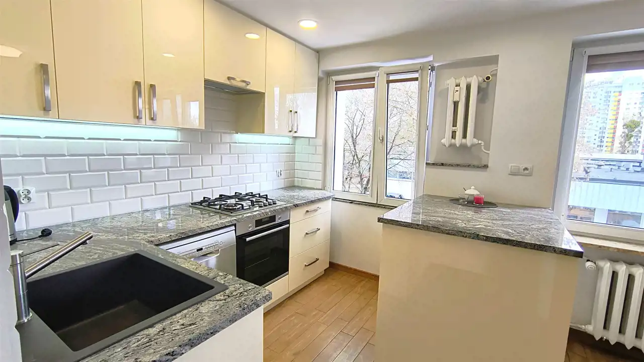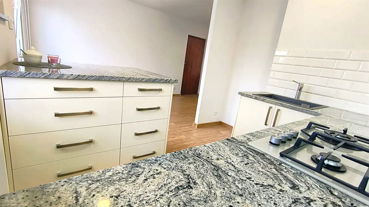 Kuchnia w zabudowie i wyposażona w sprzęt AGD. Blaty kuchenne wykonane z granitu.