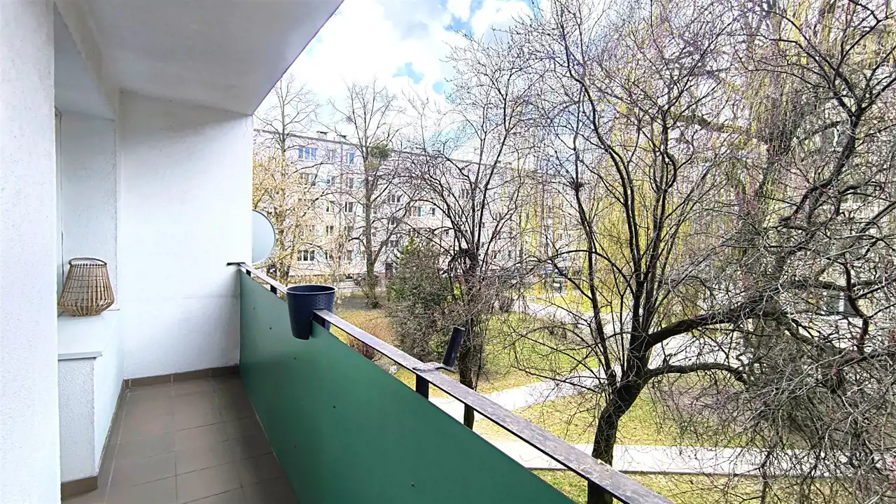 Ekspozycja mieszkania: kuchnia z częścią dzienną od strony wschodniej, pokoje i balkon od strony zachodniej z widokiem na zieloną część osiedla, dające ciszę i spokój.