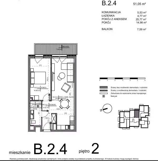 - Charakterystyka mieszkania 51.05 m2, 2 pokoje