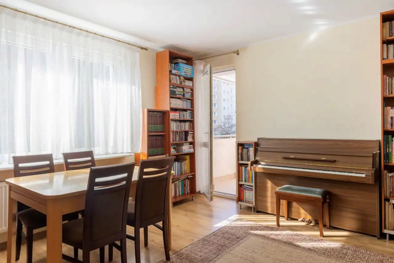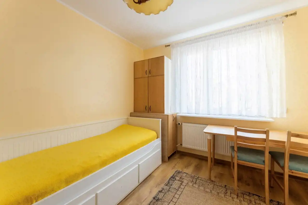 Mieszkanie bardzo ciche; na każdym piętrze zaledwie 2 mieszkania, przed blokiem skwer i bezpieczny plac zabaw i boisko, rozległy i wygodny bezpłatny parking oraz przystanek Pestki w odległości 5 minut.