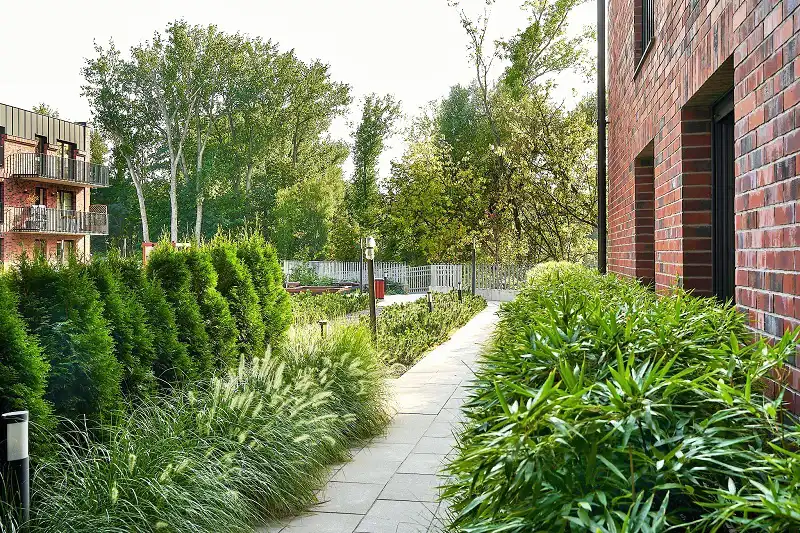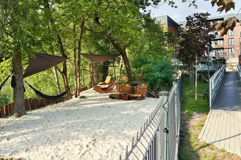 - mini plaża dla mieszkańców, dziedziniec z ławkami i placem zabaw, miejscem na ognisko,