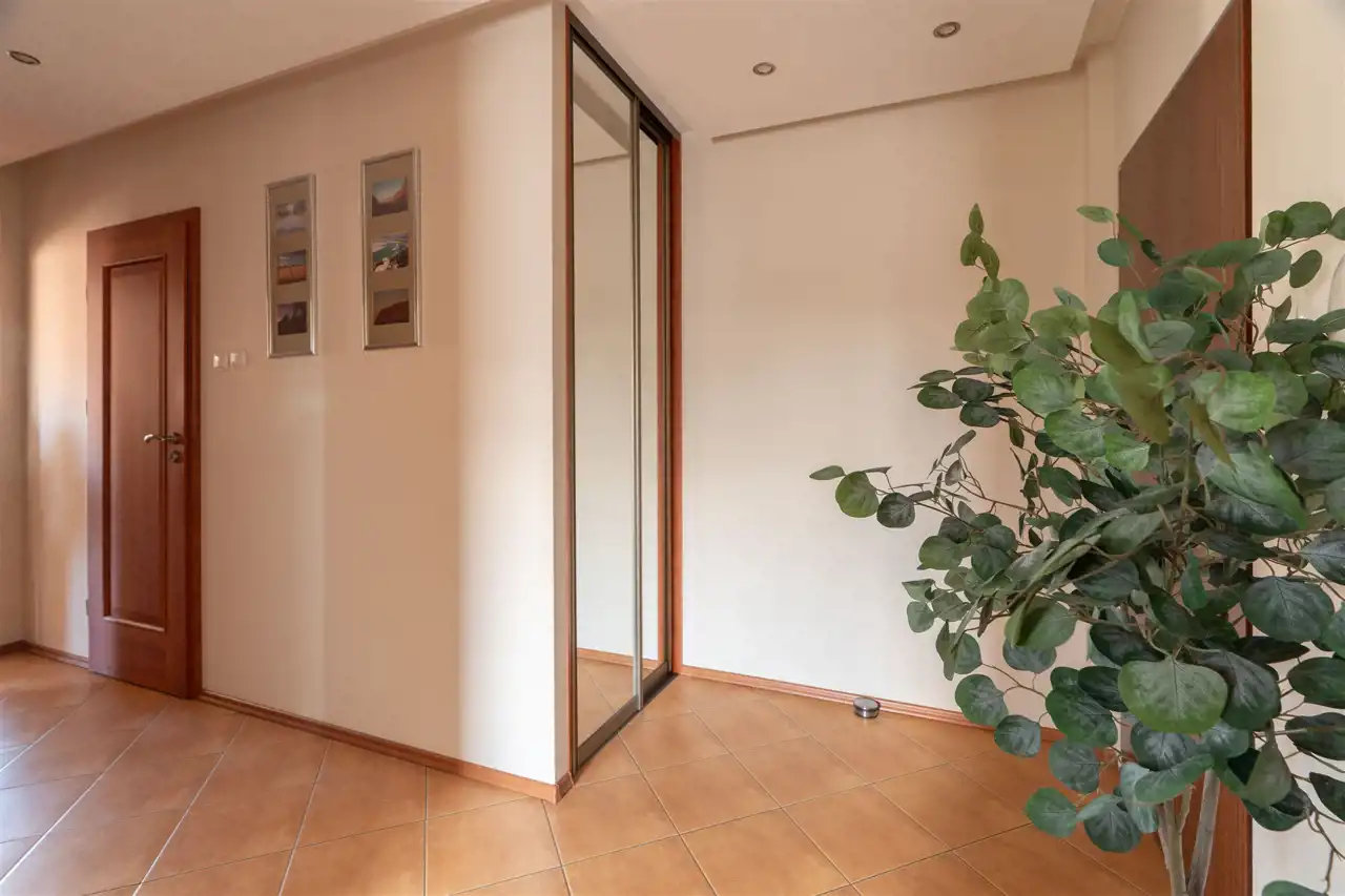 Przedpokój na podłodze gres, szafa typu Komandor, wejście do garderoby,