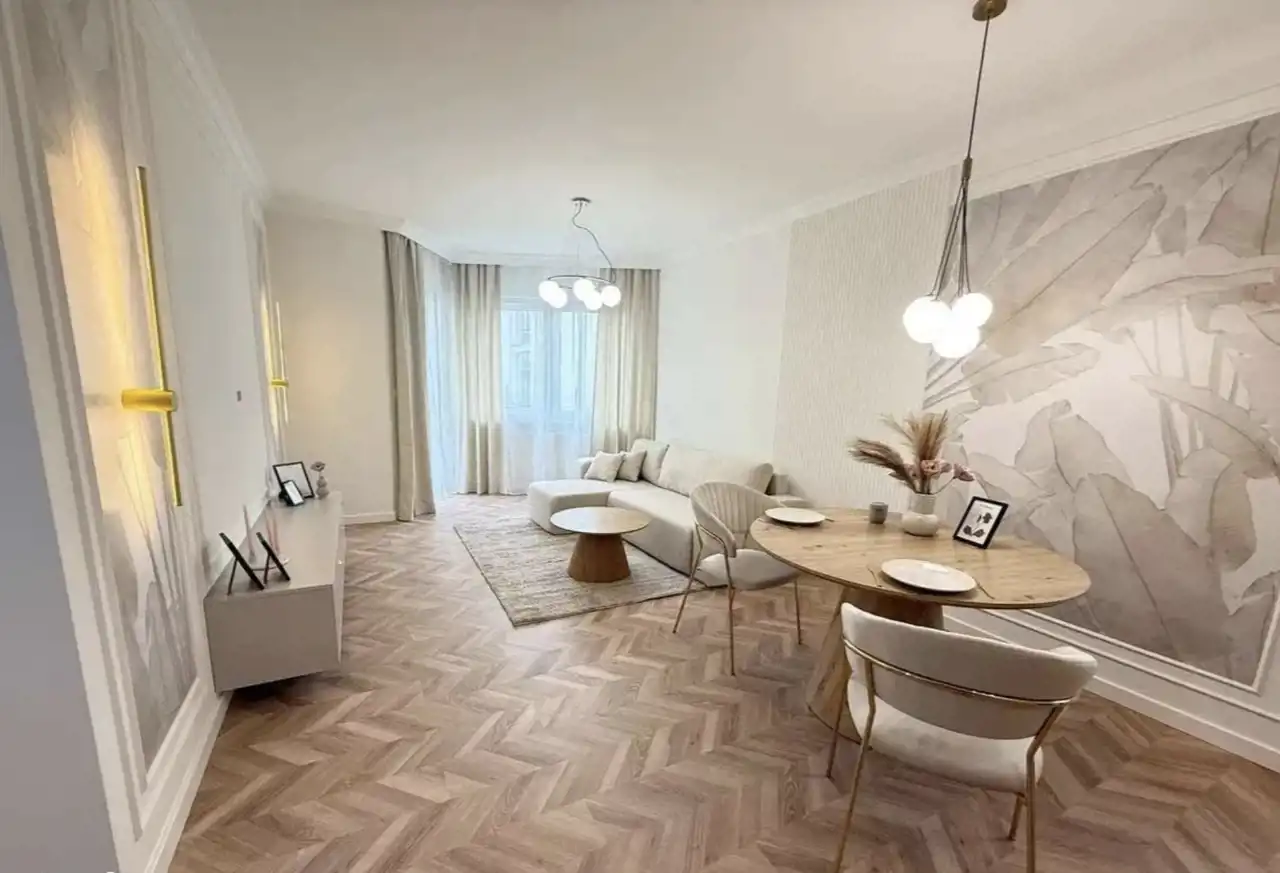 Salon: Na ścianach użyto minimalistycznej fototapety oraz sztukaterii, których prostota i elegancja nadały wnętrzu lekkości i przestronności. W salonie znajduje się nowoczesna sofa, stolik kawowy, dywan, komoda, które idealnie komponują się z zabudową kuchenną. Wyjście na zewnątrz ładny prywatny ogródek z salonu .