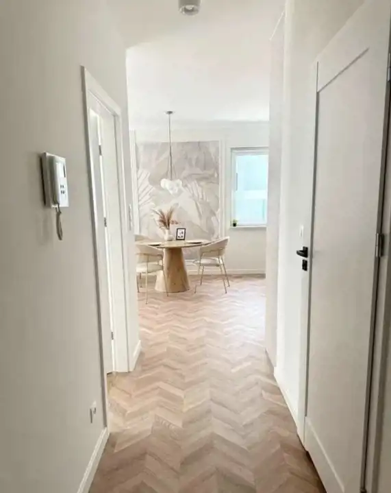Korytarz: Wyposażony w praktyczną zabudowę do przechowywania, która komponuje się z całym wykończeniem mieszkania.